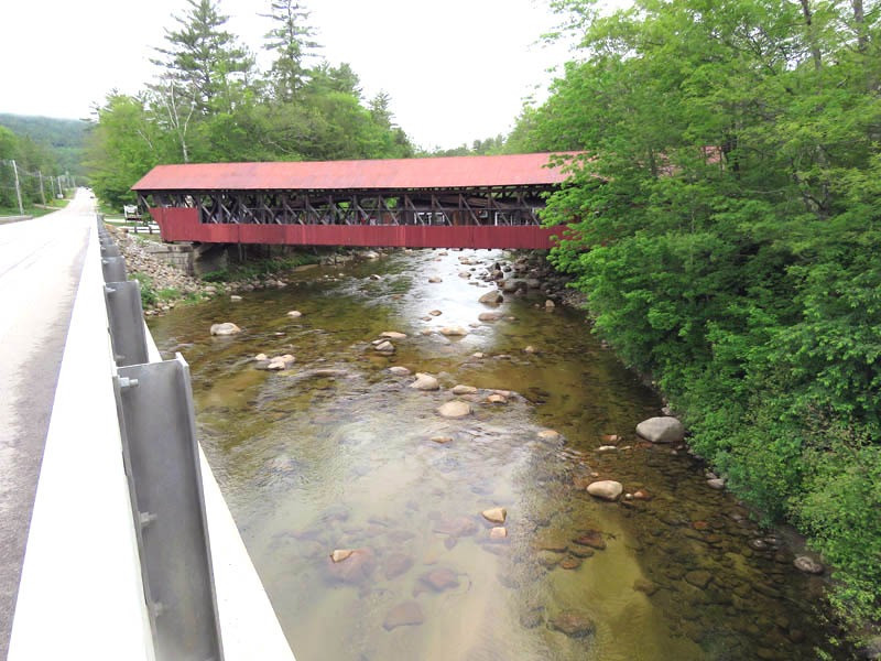 Bartlett Covered Bridge is located alongside Route 302 over the Saco River in Bartlett, NH. This bridge represents the longest surviving single-span length for this type. The bridge was replaced by a more modern bridge and placed next to the covered bridge. It's interesting to note that this is the second Paddleford truss that has been sold to private interests; the first was the circa 1867 Sanborn Covered Bridge in Lyndonville, VT, which was sold to the LynBurke Motel in 1961 and had an office built within it.