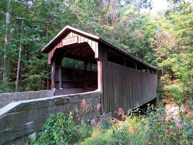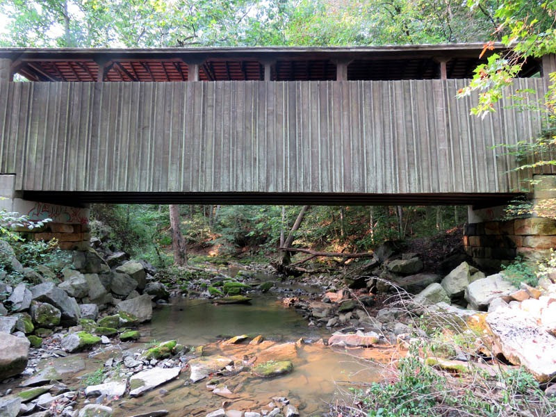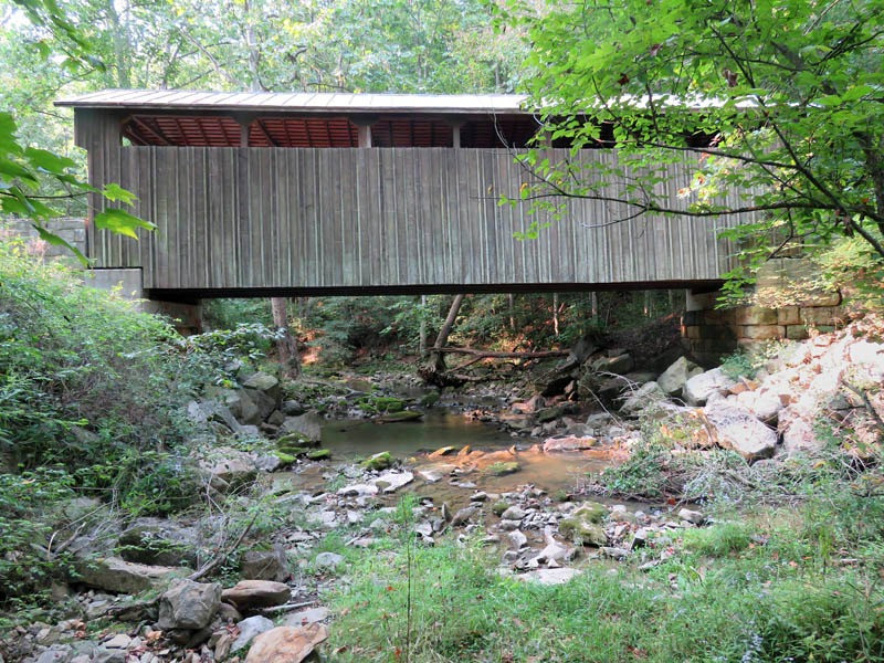 The Herns Mill Bridge originally cost $800. Renovations were made in 2000 with concrete abutments, steel I-beams, guard walls, portal timbers, a new metal roof, and siding to ensure the cover bridge's longevity.
