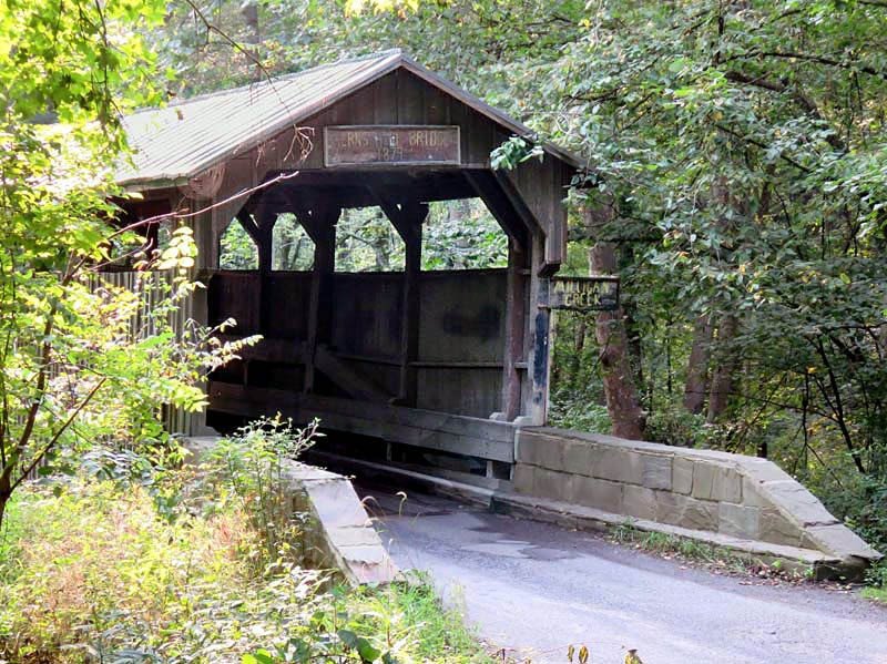 The 1884 Herns Mill Covered Bridge near Lewisburg, Greenbrier County, West Virginia. This historic covered bridge was built as a Queen post truss bridge measuring 10 feet, 6 inches wide, and 53 feet, 8 inches long. It has red board-and-batten siding and a galvanized sheet metal roof. It was built to provide access to the S.S. Hern Mill and to homesteaders living on the west side of Milligan Creek when it was in operation. It is one of two remaining covered bridges in Greenbrier County, the other being Hokes Mill Covered Bridge, and the oldest bridge in West Virginia to utilize a steel stringer design.