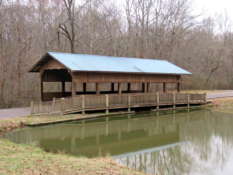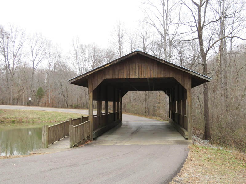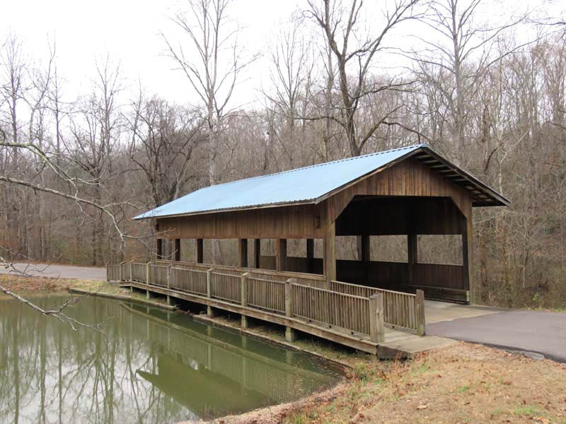 The Davy Crockett Bridge allows vehicles to cross the Little Shoal Creek near Crockett Falls. A pedestrian walkway is on one side of the bridge. Five windows are on each side (East and West), and the roof is pitched. The concrete road through the park is on both sides of the bridge, which has a wooden foundation.