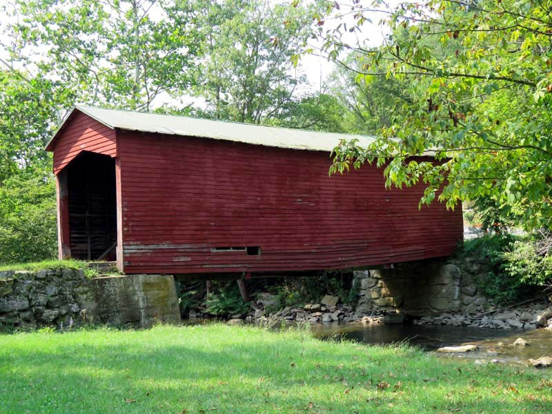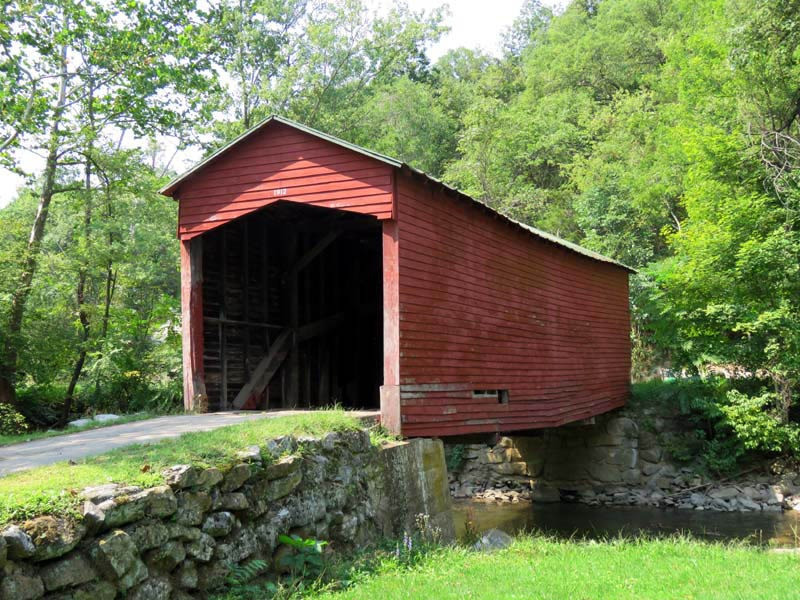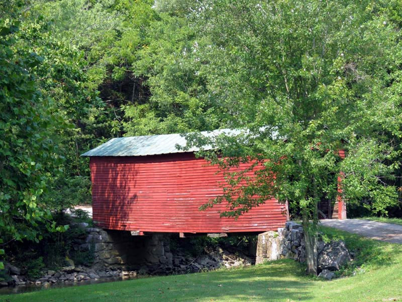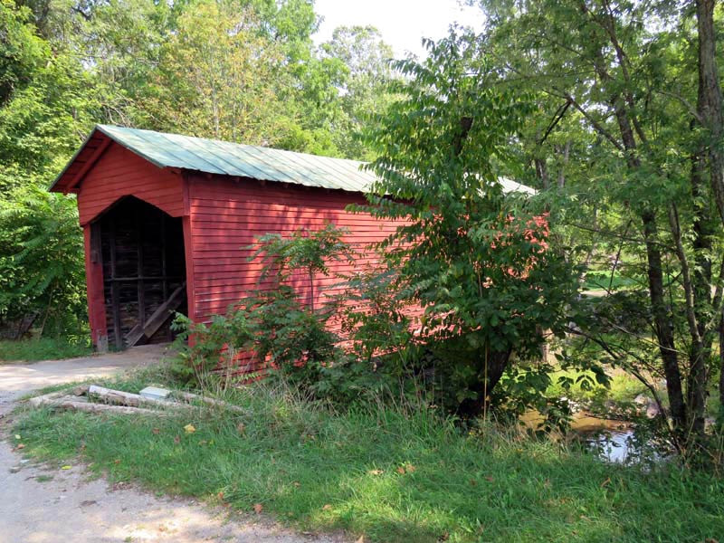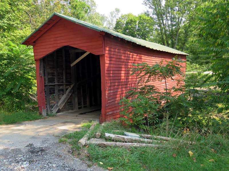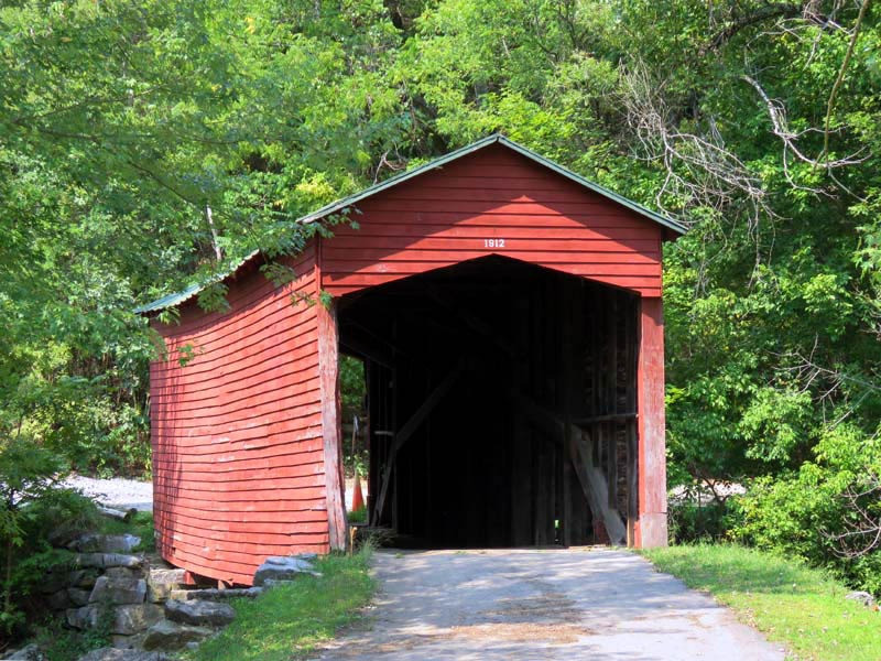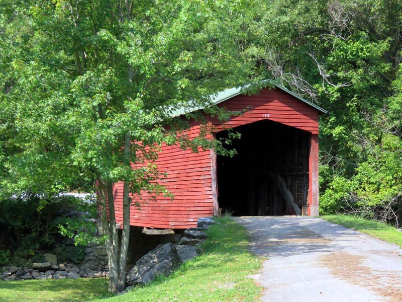 The 1912 Link Farm Covered Bridge spanning Sinking Creek in Giles County, Virginia. This 50-foot single-span bridge modified with iron rods is one of three covered bridges remaining in Giles County. This bridge is not open to vehicle traffic and is located on private property. Built in 1912 by James Maurice Puckett, it was bypassed in 1949, repaired in 1995, and took damage from Tropical Storm Gaston in 2004. The bridge is a Queenpost. It is also called the Mountain Lake Covered Bridge and the Bradley Covered Bridge.