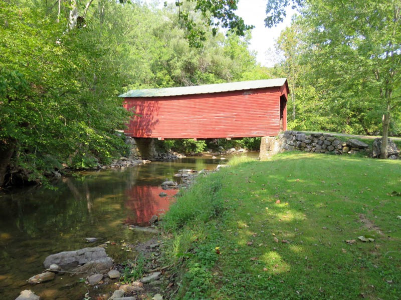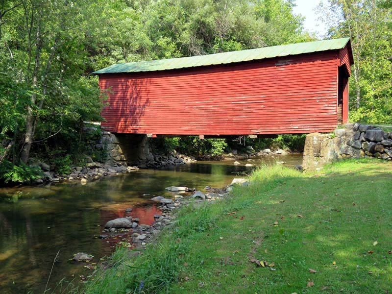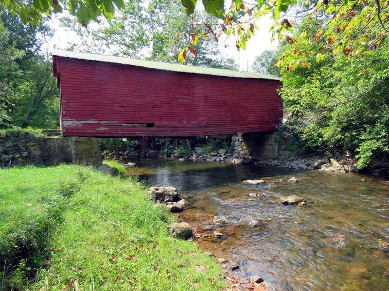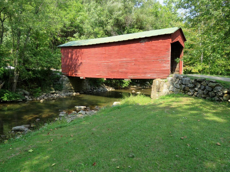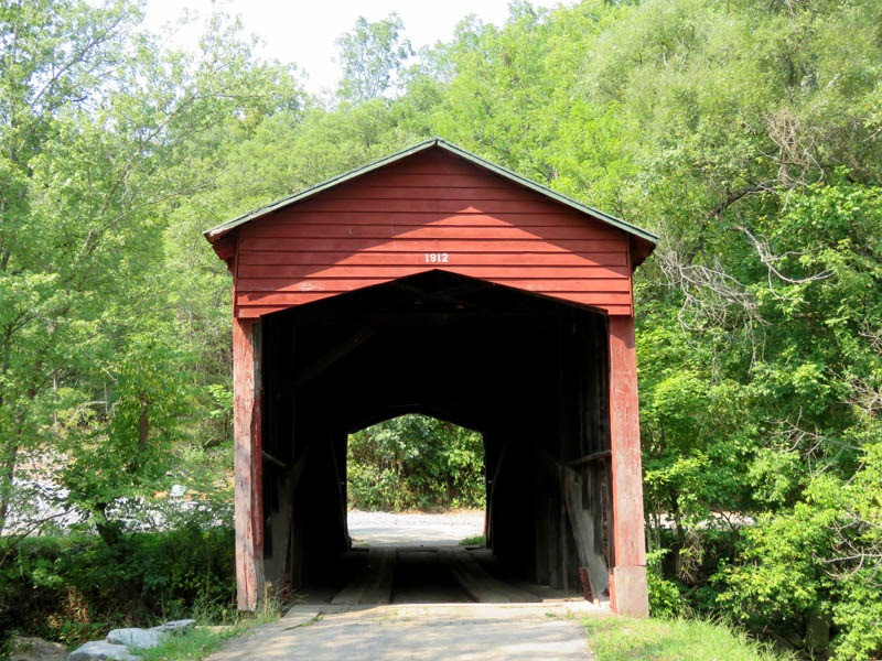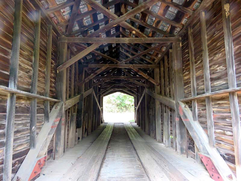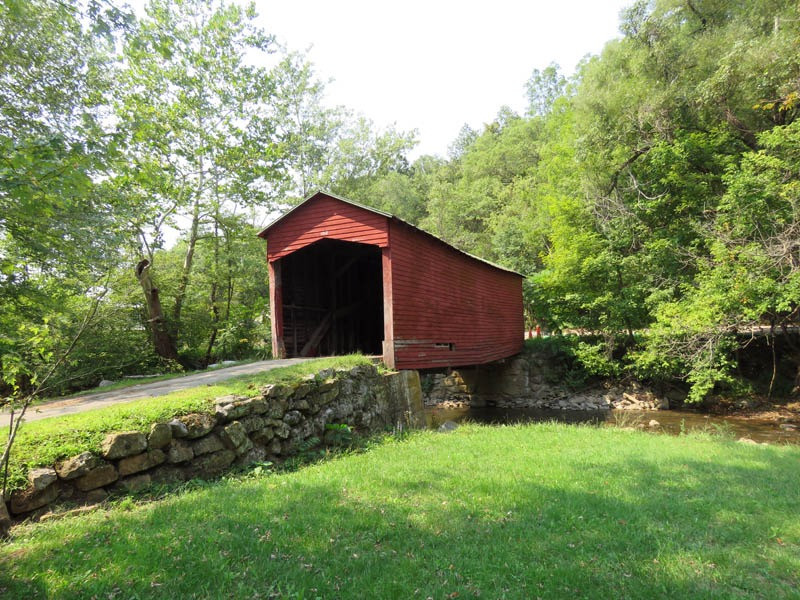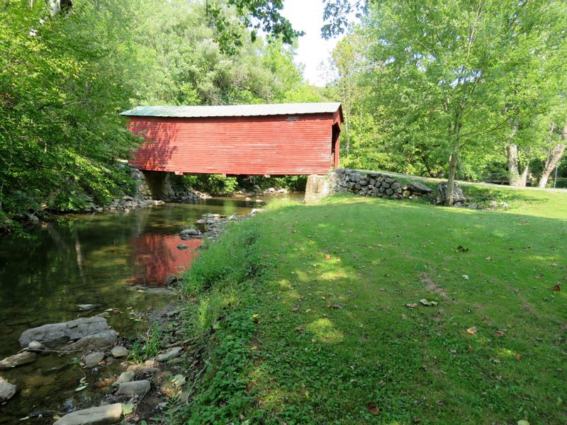 The 1912 Link Farm Covered Bridge spanning Sinking Creek in Giles County, Virginia. This 50-foot single-span bridge modified with iron rods is one of three covered bridges remaining in Giles County. This bridge is not open to vehicle traffic and is located on private property. Built in 1912 by James Maurice Puckett, it was bypassed in 1949, repaired in 1995, and took damage from Tropical Storm Gaston in 2004. The bridge is a Queenpost. It is also called the Mountain Lake Covered Bridge and the Bradley Covered Bridge.