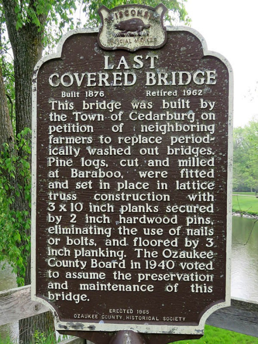 The Ozaukee County Board took over the bridge's preservation and maintenance in 1940, and in 1960, Ozaukee County bought the bridge and surrounding land for $7,500 and developed the area into Covered Bridge County Park.