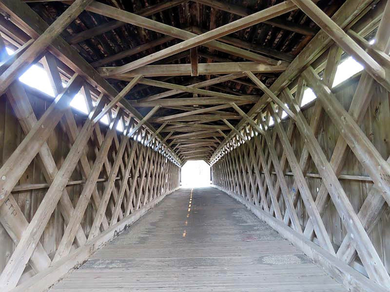 The 1876 Cedarburg Covered Bridge in Ozaukee County, Wisconsin, is the last remaining original covered bridge in the state, which once had approximately 40 covered bridges. Originally called Red Bridge, this 120-foot-long, two-span bridge made of pine with oak lattices was built to cross Cedar Creek. Situated in a north–south orientation, it is 17 feet wide and has a height of about 18 feet from the top of the abutments to the tip of the roof. The interior, from the deck to the top of the knee braces, is approximately 13 feet.