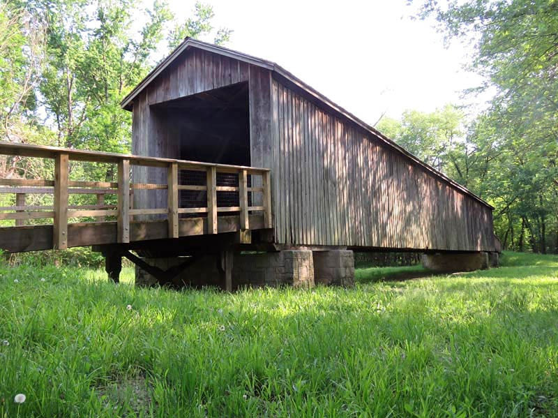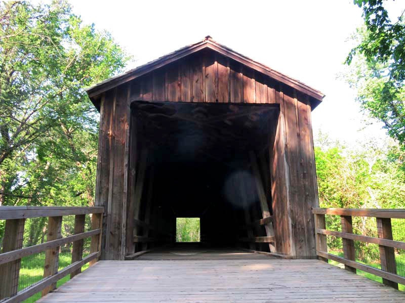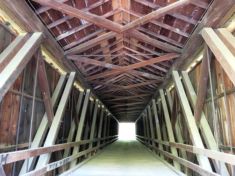 In August 1868, a contract was awarded by the Linn County Commissioners to Bishop & Eaton for a single-lane bridge across Locust Creek, with the cost not to exceed $5,500. Patented in 1840, this Howe truss design was constructed of white pine. True to its design, vertical iron rods tightly secure diagonal wooden beams to the bottom and top of the structure. The bridge also features arched entrances with ramps sloping away from both ends.
